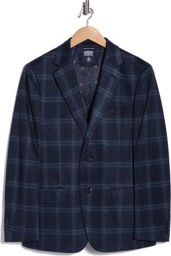 Elevate your wardrobe with this blue plaid sport coat framed by notched lapels and flap pockets for polished style.