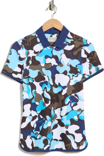 Contrast trim and an abstract pattern make golf knit T-shirt versatile on and off the course.