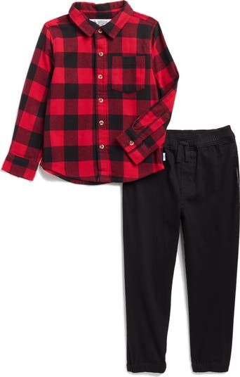 Signature plaid checks lend cold-weather comfort to the button-up shirt in an easygoing set complete with stretch-cotton joggers.