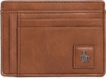 An iconic penguin logo patch punctuates the left corner of this slim card case made from faux leather.