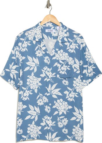 A palm print creates an easygoing vibe in a button-up camp shirt framed with short sleeves and a convertible collar.