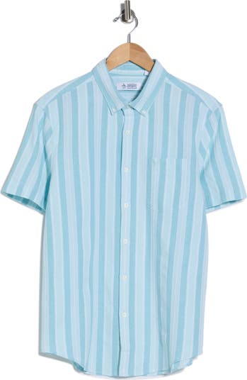 The sun is calling, and this button-up shirt answers with its breathable cotton comfort and an eye-catching stripes.