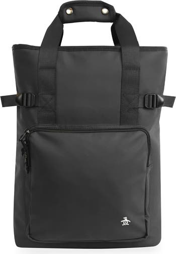 A plethora of secure storage pockets equip a tote-style backpack that comes with convenient top handles and a waterproof shell.