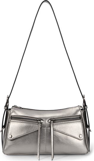 A metallic finish enhances the effortlessly cool style of a moto-inspired shoulder bag featuring plenty of pockets for your essentials.