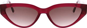 Chic logos at the temples add designer distinction to slim modern cat-eye sunglasses fitted with protective, tinted lenses.