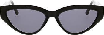 Chic logos at the temples add designer distinction to slim modern cat-eye sunglasses fitted with protective, tinted lenses.