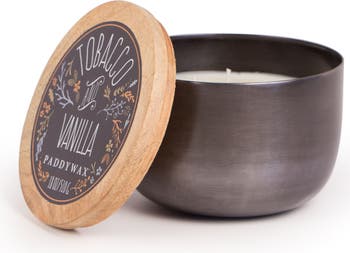 Hand-poured in Nashville, a sleek metallic vessel with a wooden lid houses a fragrant and earthy soy wax candle.