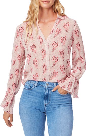 Ruffle-trimmed bell sleeves add a whisp of romance to a delicate silk blouse covered in swirls of flowers.