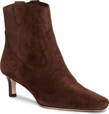 Decorative stitching and pronounced seams bring Western-inspired styling to a square-toe boot lifted by a kitten heel for subtle height.