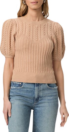 Braided cables bring warmth and texture to this cotton-and-silk-blend sweater framed by puff sleeves and accented with soft ribbing for a close fit.