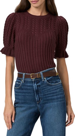 Braided cables and puffy sleeves bring a touch of sweetness to a crewneck top knit with a hint of silk to elevate casual or dressier looks.