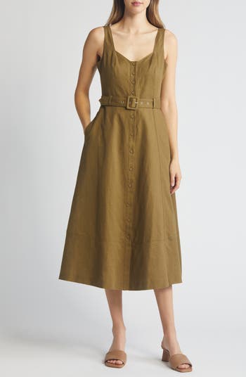 Move confidently from day to date night in this sleeveless midi fashioned from a lightweight blend of linen and cotton and finished with a waist-defining belt.