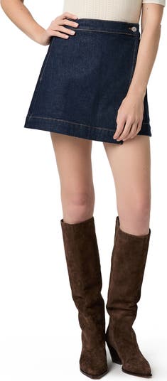A wrap front panel with glossy button adds a polished finish to this skort made of low-stretch denim for warm-weather days.