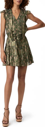 Soft ruffles flutter at the shoulders of this shimmering metallic mini designed with a flouncy tiered skirt.