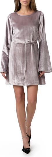 A slender tie belt defines the waist of this stunning satin dress cut in a leggy length and framed by subtly flared long sleeves.