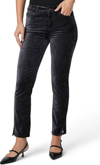 Lustrous stretch velvet brings a glamorous look to slim-cut straight-leg pants featuring twisted seams that end in slit hems.
