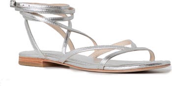 Slender metallic straps define a caged gladiator sandal featuring an easy ankle-buckle closure.