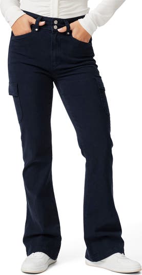 Trend-right utility pockets update the style of flared, full-length trouser jeans made from stretch denim in an everyday medium wash.