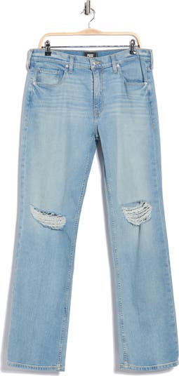 Distressed knees and brightly faded thighs bring lived-in appeal to straight-leg jeans cut from low-stretch cotton.
