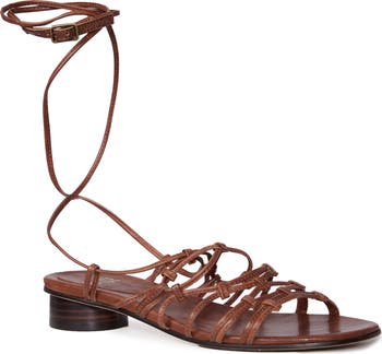 Sleek straps wrap the ankle of a caged leather sandal grounded by a cushioned footbed and low cylindrical heel.