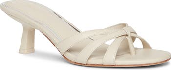 Slender leather straps convene at a center toe post on a minimalist flip-flop set on a low, sculptural heel for walkable height.