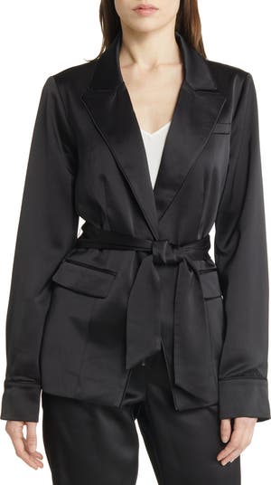 Elevate your day-to-night look in this rich satiny blazer tethered with a defining waist tie.