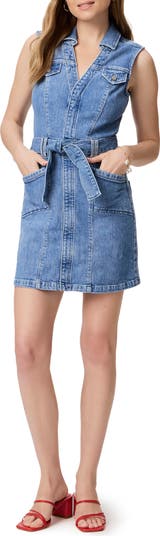 Mini button-flap pockets punctuate the yoke of this sweet and sassy shirtdress cut from stretch-hinted denim with a matching tie belt.
