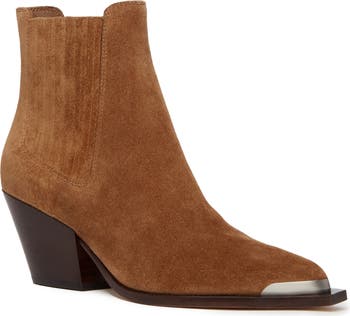Hidden goring insets add modern design to a luxe Chelsea boot balanced by a pointy toe and stacked block heel.