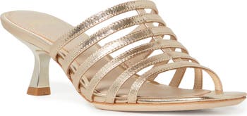 A strappy caged silhouette and sculptural heel distinguish this elegant all-leather sandal that offers endless styling possibilities.
