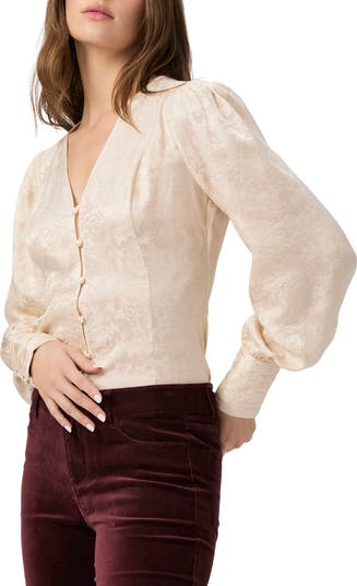 Cut from luxurious silk, this elevated desk-to-dinner top is covered in faint tonal blooms and framed by charming puffed shoulders.