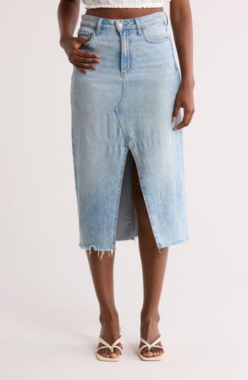 A faded wash and raw hem enhance the laid-back feel of a stretch denim midi skirt punctuated by a front slit for easy movement.