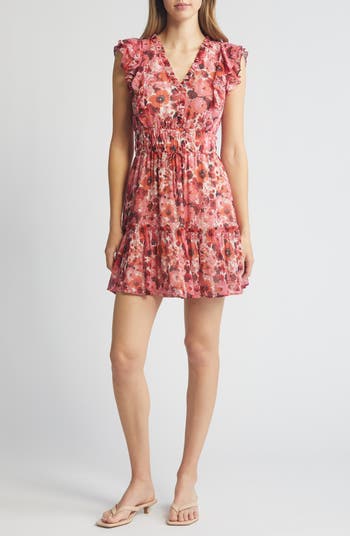 Romantic blooms romance this frill-trimmed mini crafted from luxe silk and framed by fluttering sleeves.