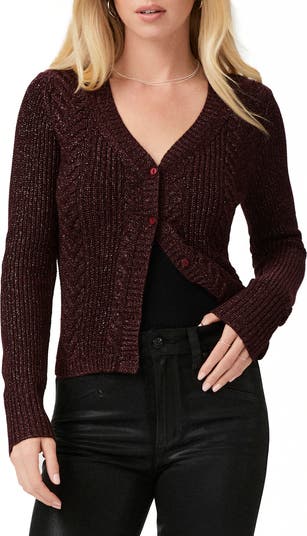Classic cable stitching furthers the textural allure of this wool-kissed V-neck cardigan shimmered with metallic yarns.