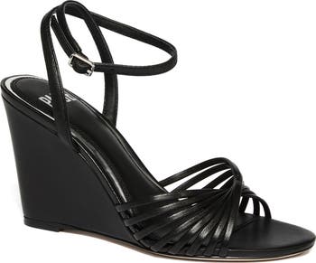 Slender straps fan elegantly across the toe of this ankle-wrap sandal perched on a sculpted wedge heel.