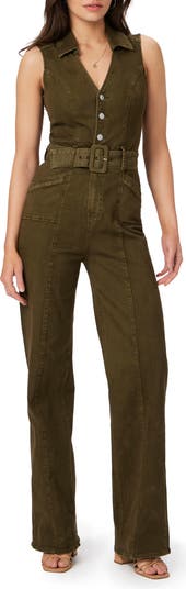 A matching belt tethers the waist of this throwback denim jumpsuit cut in a sleeveless silhouette with a johnny collar and flared legs.
