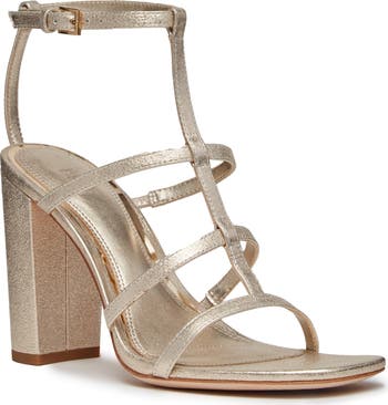 Slender straps create a cage-inspired silhouette on a metallic sandal framed by a square toe and lofty block heel.