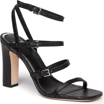 Slender straps with gleaming buckles elegantly frame the top of this square-toe sandal finished with snake-embossing and perched on a towering half-moon heel.