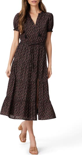 Delicate flowers pattern this airy short-sleeve midi dress with a demure side slit and flippy flounce at the hem.