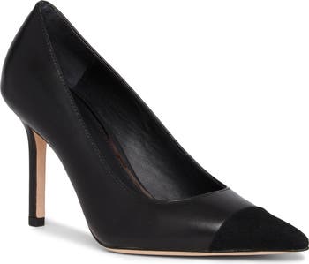 A pointy cap toe adds visual intrigue to a poised leather pump lofted by a stiletto heel for an elevated finish.