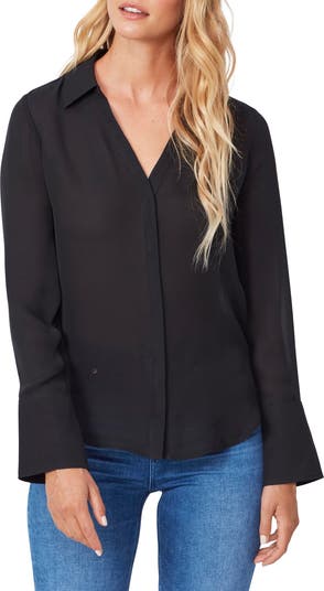 A lightweight silk blouse features a versatile solid hue and extra-wide, gently flared sleeve cuffs for a dash of drama.