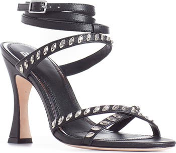 Faceted gems add a bold shimmer to the slender straps of a sandal lofted by a demi-flare heel.