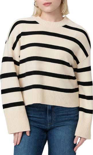 A cuddly wool blend keeps you toasty, comfortable and looking chic in a crewneck sweater patterned in bold stripes.