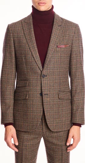 Dress to impress in a slim-fitting blazer topped with peaked lapels and cut from stretch-kissed wool in a houndstooth plaid design.