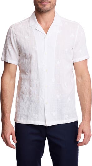 This cotton-blend button-up camp shirt exudes easygoing charm with its trim silhouette and allover embroidery.
