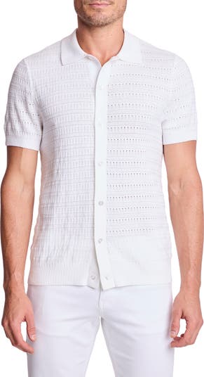 A geometric pattern brings textural edge to this trim-fit linen-blend knit polo styled with a button placket.