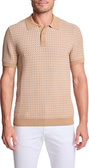 A geometric pattern brings textural edge to this knit polo styled with a contrasting collar, placket, sleeve cuffs and back.