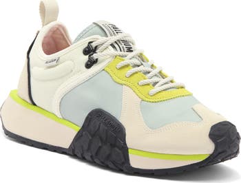 An aggressive tread wraps around the side of a techno-inspired sneaker boasting plush cushioning and a breathable lining.