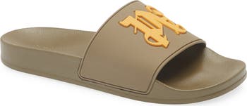 Dimensional logo lettering in the house's gothic font brands the strap of this lightweight slide molded with a contoured footbed for effortless comfort.