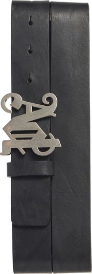 A sleek leather belt finished with an Old English monogram buckle brings bold designer flair to your look.
