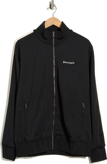 Embroidered stripes race up the sleeves and across the shoulders of a stretchy, all-activity track jacket sporting zip pockets and a small embroidered logo.